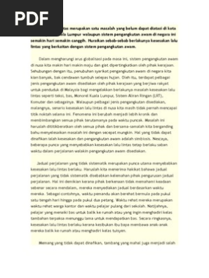 Masalah kesesakan lalu lintas dapat dikurangkan Idea 6 Menjimatkan masa - Pengangkutan awam dapat membendung masalah kesesakan jalan raya yang semakin kronik. Share on Facebook. Usaha Meningkatkan Sikap Cinta akan Negara.